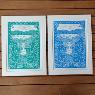 Mi neshi hefyd gymryd y cyfle i ffotograffu printiau lino o Forwyn Llyn y Fan wnes i yn mis medi - mi wnes i dalu i'w mowntio nhw yn oriel Moelwyn a dwi'n rili ples efo'r ffordd mae nhw'n edrych rwan. Dwi'n edrych ymlaen i'w rhyddhau nhw - dwi isho rhoi chunk o'r elw i elusen trais yn y cartref yn sgil yr holl adroddiadau ofnadwy 'ma sydd wedi dod allan yn ddiweddar am y cynnydd mewn trais yn y cartref yn ystod y pandemic: